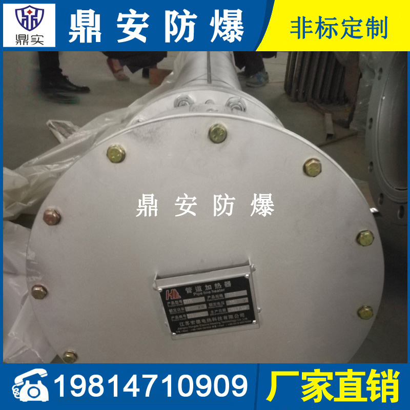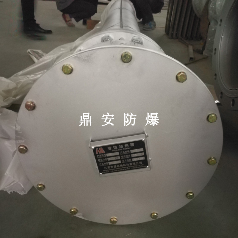 防爆法蘭式電加熱管按結構分大致可分為螺牙型和平板式法蘭型加熱器,常見的電壓:200V-220V-380V,功率按發熱根據發熱尺寸不同有:3KW-4.5KW-6KW-8KW-9KW-10KW-12KW-15KW-18KW-21KW等,通常由3-6-9支U型雙頭加熱管通過TIG氬弧焊接于法蘭組合而成。常作為鍋爐加熱器、槽體加熱器、模溫機加熱器等使用,廣泛運用于電子、塑膠、化工、環境工程的槽體-罐體-設備的加熱。螺牙型法蘭加熱器,常見的安裝螺牙(絲牙)尺寸有:1寸-1.5寸(M47*2.5)-2寸(M58*2.5)管螺牙;平板式法蘭型加熱器,常見的安裝法蘭標準有日標和國標兩種,大小有:DN32-DN40-DN50-DN65-DN80-DN100-DN125-DN150-DN200-DN250-DN350-DN400-DN450等,如日標JIS150 法蘭加熱器常見的壓力有6kg-10kg-16kg-25kg;