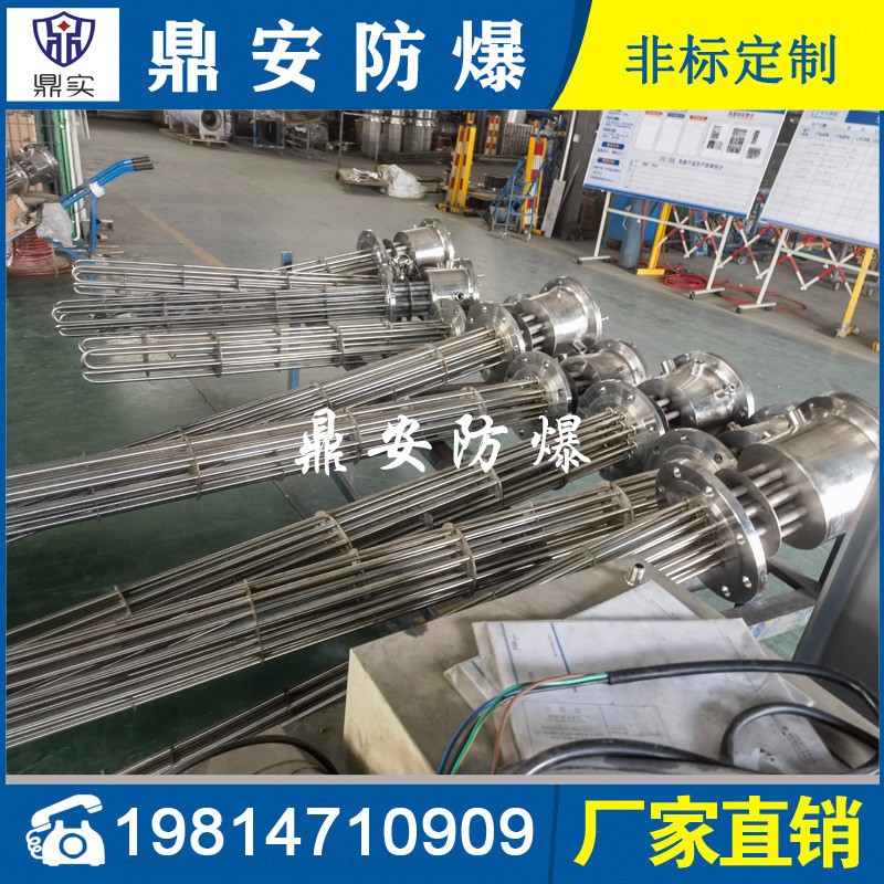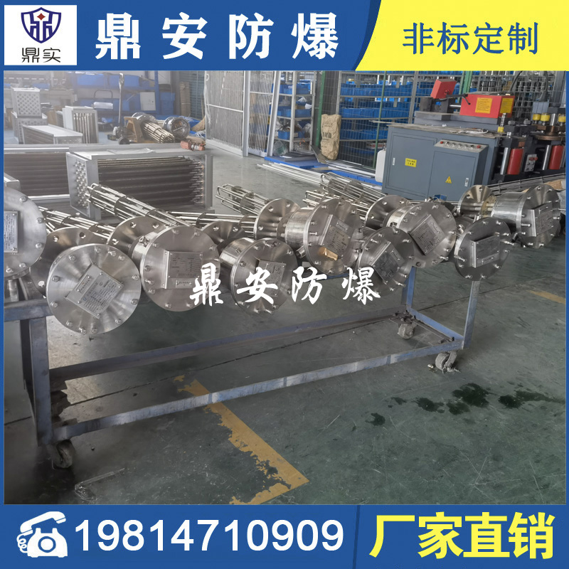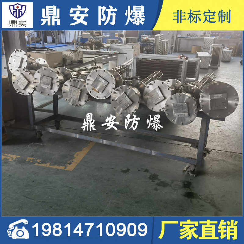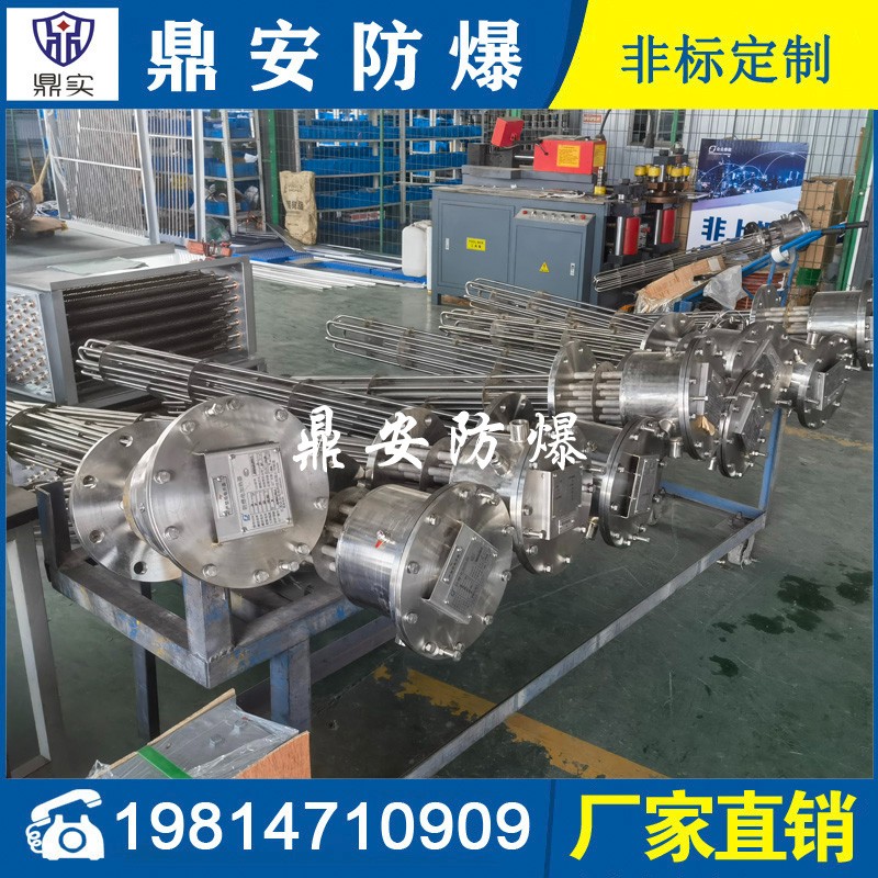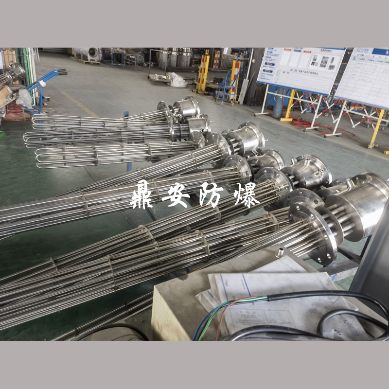 防爆法蘭加熱管是由多支加熱管焊接在法蘭上集中加熱。主要用于敞開式、封閉式的溶液箱和循環系統中加熱用。優點: 表面功率大,使一般電加熱表面負荷的2~4倍,高度密集式、結構緊湊。由于整體短而密集,故穩定性好,安裝無需支架。組合式法蘭加熱管大多采用氬弧焊接方式使電熱管于法蘭連接,也可利用緊固裝置的形式,即每支電熱管上焊由緊固件。然后與法蘭蓋采用螺母鎖緊。管子于緊固件采用氬弧焊接。緊固件密封處采用科學的工藝。單支更換方便,大大節約以后的維修成本選擇進口及國內優質材料??茖W的生產工藝,嚴格的質量管理,保證電熱管優越的電氣性能。