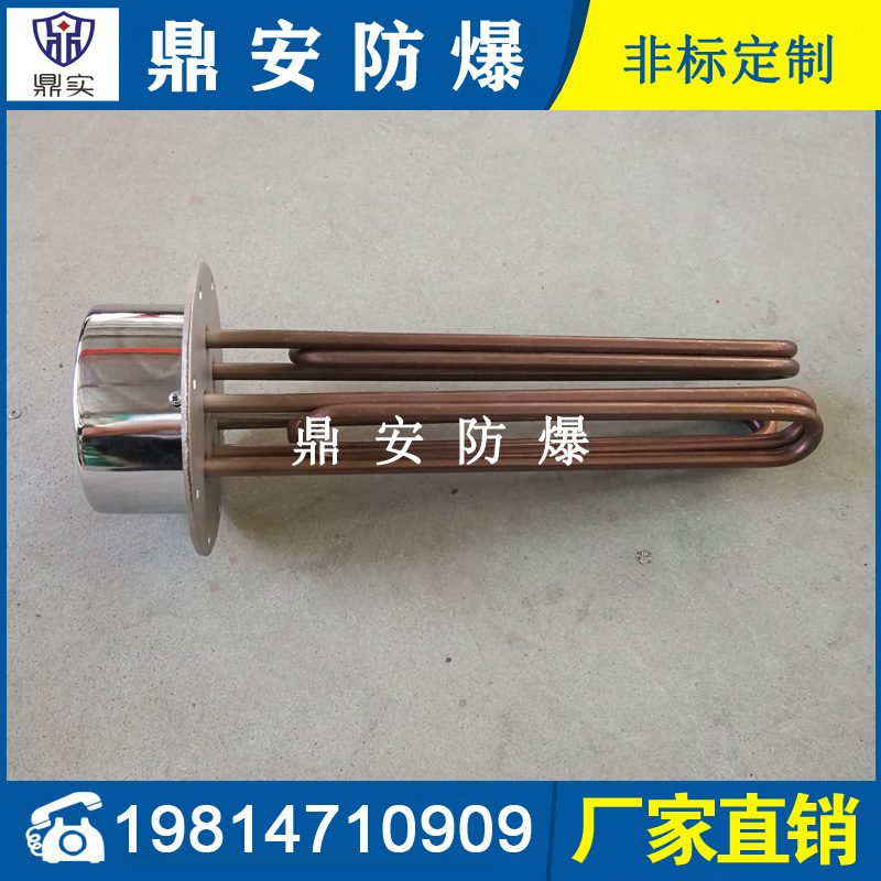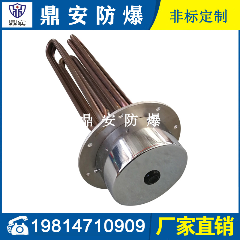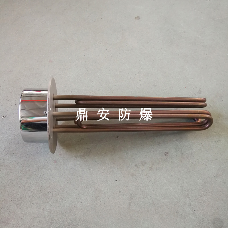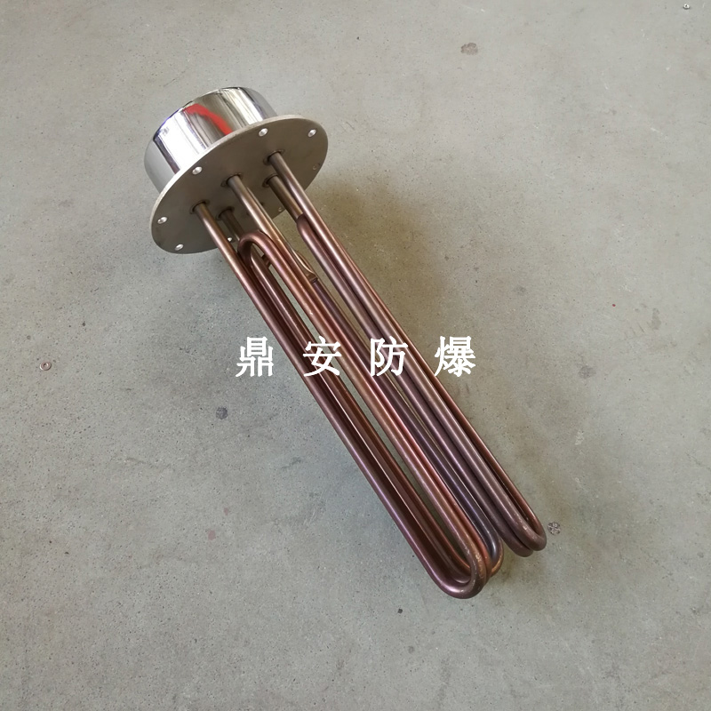 法蘭電熱管(也稱插入式電加熱器):是采用U型管狀電熱元件,多支U型電熱管焊接在法蘭上集中加熱,依據加熱不同介質設計規范,按照功率配置要求裝配在法蘭蓋上,插入需加熱物料中,發熱元件工作時所發出的大量熱量傳導給被加熱介質使介質溫度升高,達到所需的工藝要求,主要用于敞開式、封閉式的溶液箱和循環系統中加熱用。