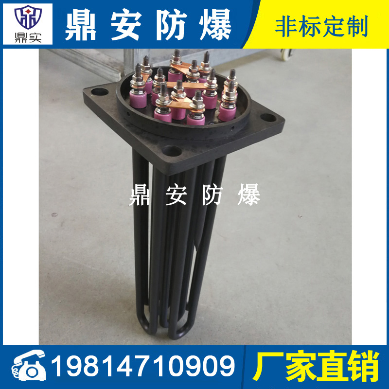 法蘭電熱管(也稱插入式電加熱器):是采用U型管狀電熱元件,多支U型電熱管焊接在法蘭上集中加熱,依據加熱不同介質設計規范,按照功率配置要求裝配在法蘭蓋上,插入需加熱物料中,發熱元件工作時所發出的大量熱量傳導給被加熱介質使介質溫度升高,達到所需的工藝要求,主要用于敞開式、封閉式的溶液箱和循環系統中加熱用。