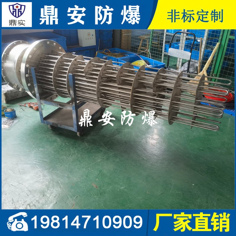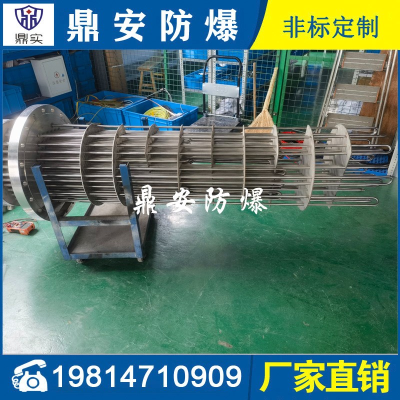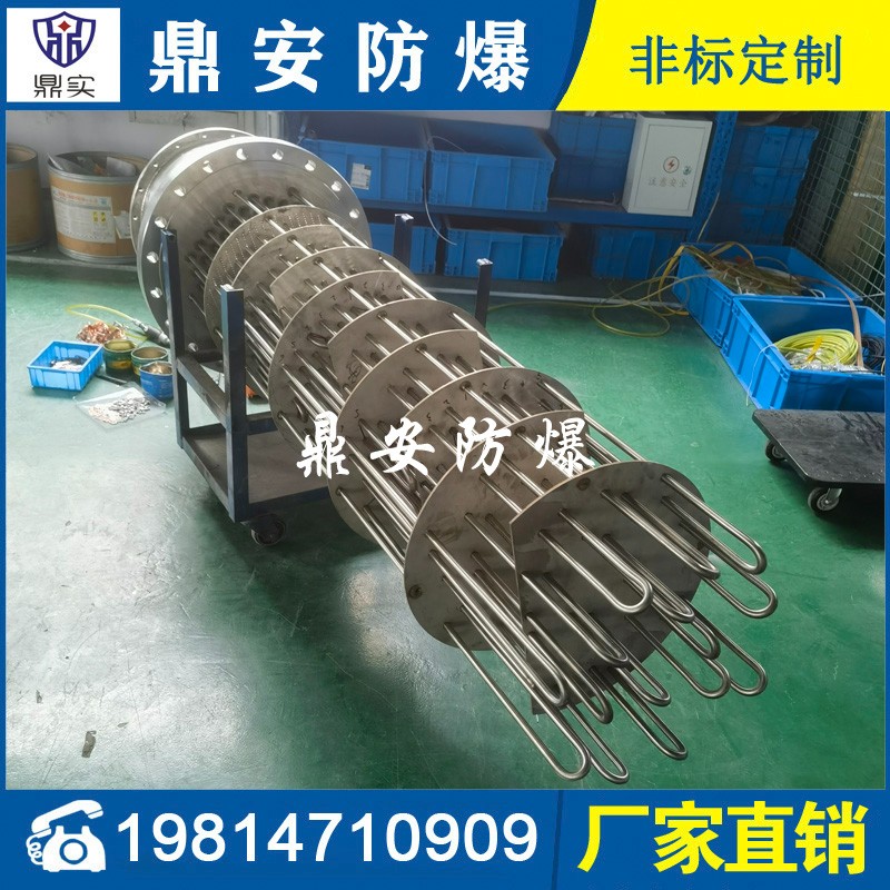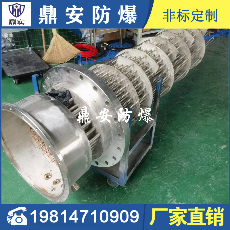 防爆法蘭加熱管是由多支加熱管焊接在法蘭上集中加熱。主要用于敞開式、封閉式的溶液箱和循環系統中加熱用。優點: 表面功率大,使一般電加熱表面負荷的2~4倍,高度密集式、結構緊湊。由于整體短而密集,故穩定性好,安裝無需支架。組合式法蘭加熱管大多采用氬弧焊接方式使電熱管于法蘭連接,也可利用緊固裝置的形式,即每支電熱管上焊由緊固件。然后與法蘭蓋采用螺母鎖緊。管子于緊固件采用氬弧焊接。緊固件密封處采用科學的工藝。單支更換方便,大大節約以后的維修成本選擇進口及國內優質材料。科學的生產工藝,嚴格的質量管理,保證電熱管優越的電氣性能。